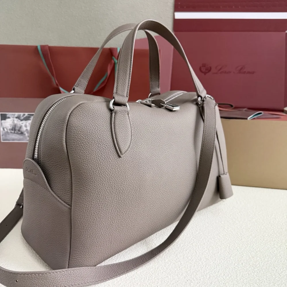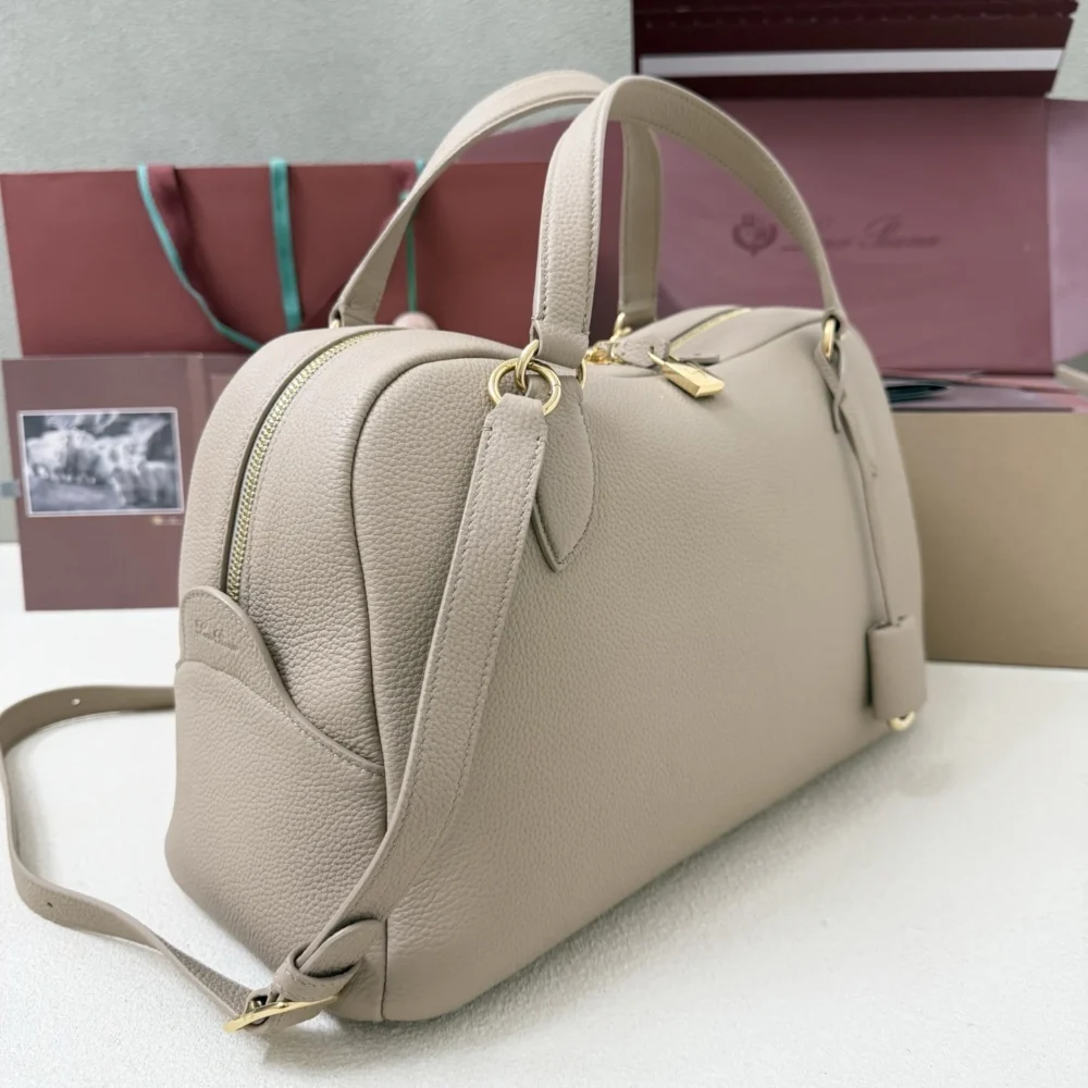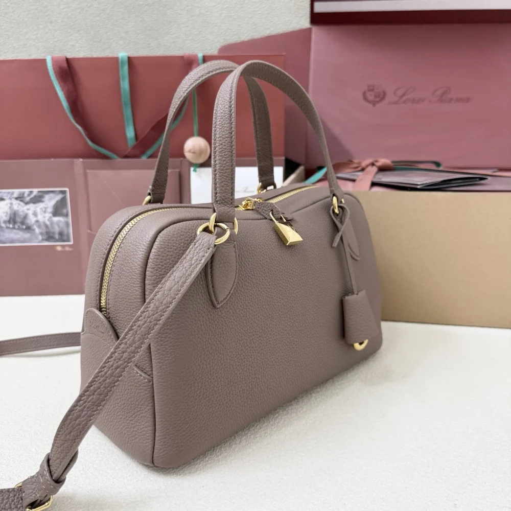 Here presented in a small size, the Needle is a Loro Piana interpretation of the bowling bag, complete with the iconic LP charms. Evoking the Maison’s textile heritage, it is inspired by the bags used to carry knitting needles. It is constructed with soft, sinuous lines, allowing for versatile wear over the shoulder or in hand. Crafted from fine-grained leather with a velvety suede lining, it has a harmonious silhouette and is made with a single piece of leather along the sides.