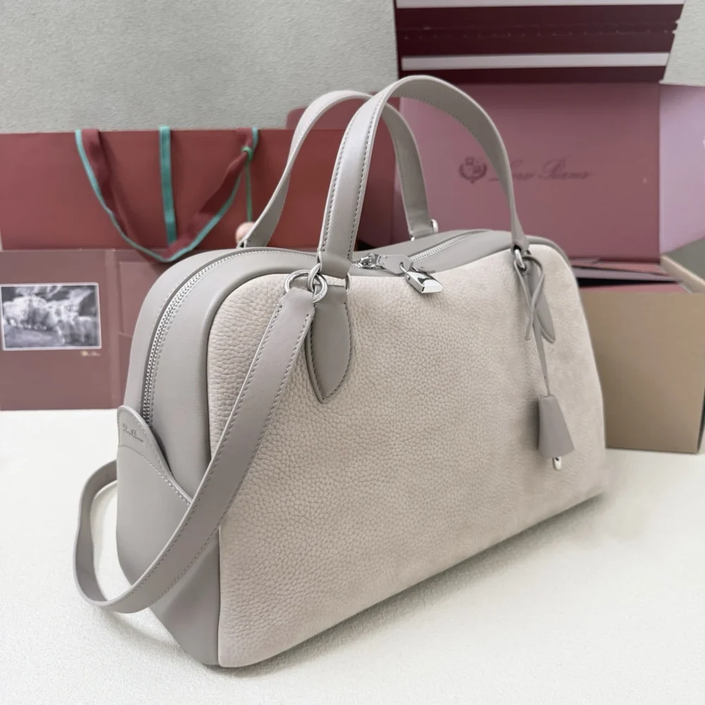 Here presented in a medium size, the Needle is a Loro Piana interpretation of the bowling bag, complete with the iconic LP charms. Evoking the Maison’s textile heritage, it is inspired by the bags used to carry knitting needles. It is constructed with soft, sinuous lines, allowing for versatile wear over the shoulder or in hand. Crafted from Grained Nabuk with a velvety suede lining, it has a harmonious silhouette and is made with a single piece of leather along the sides.