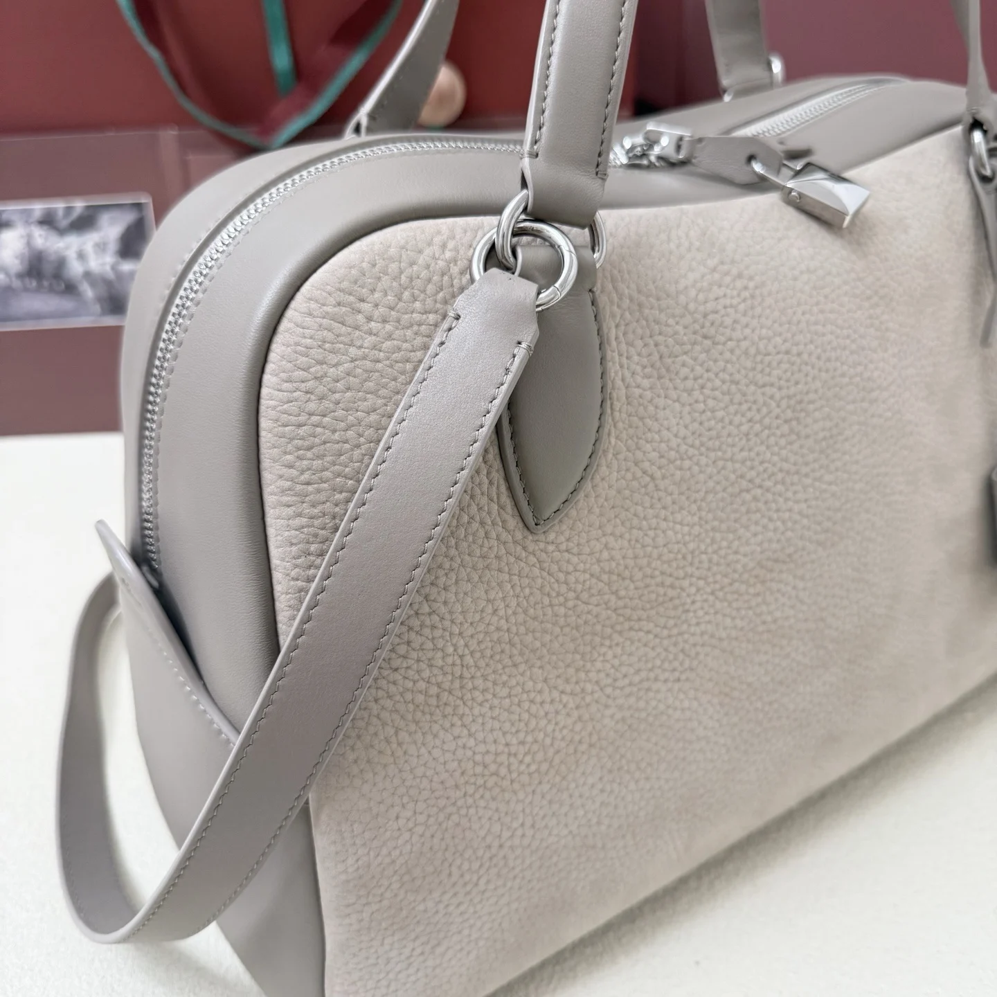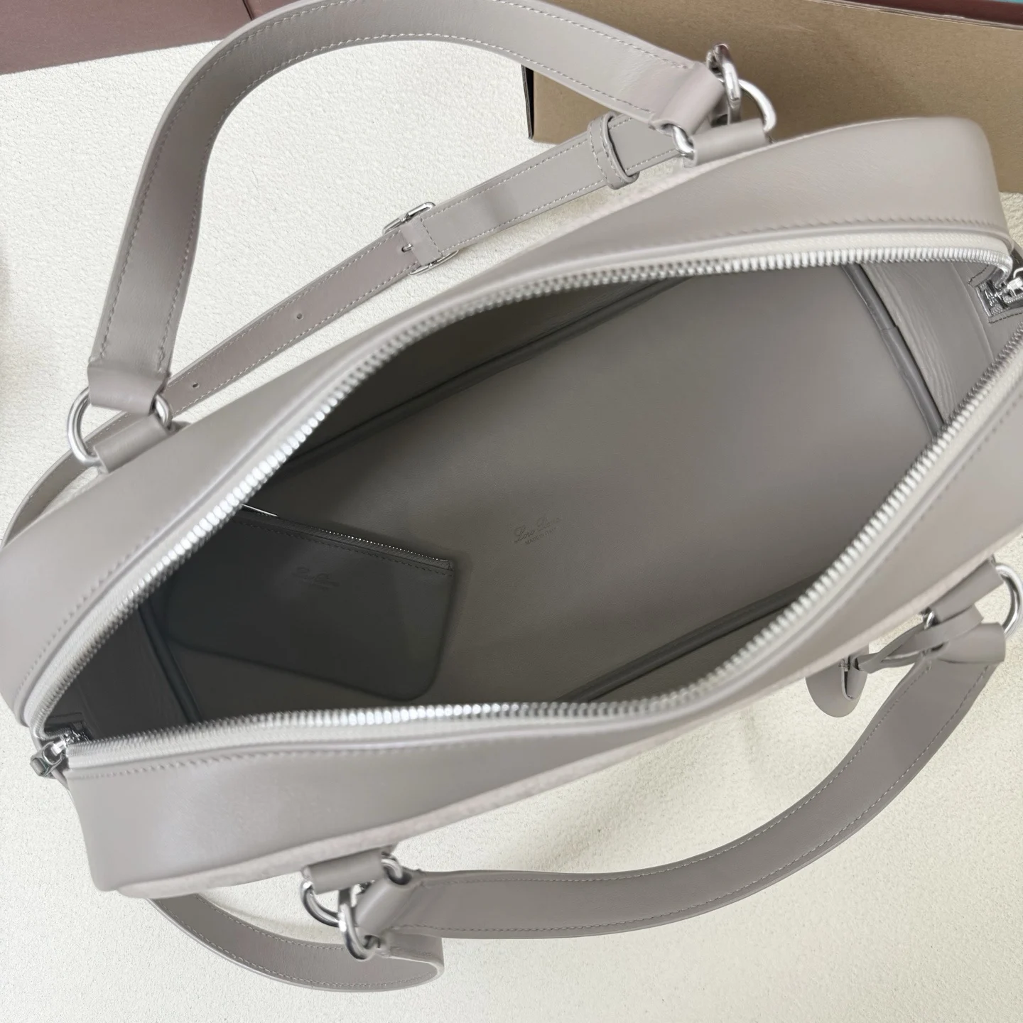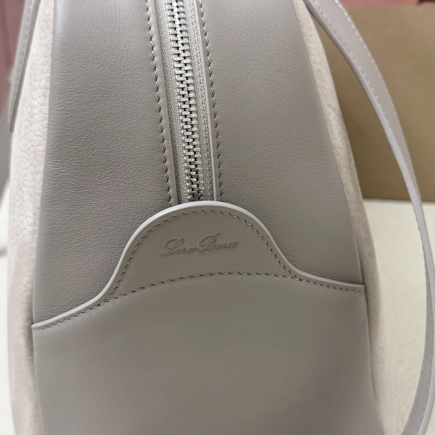 Here presented in a medium size, the Needle is a Loro Piana interpretation of the bowling bag, complete with the iconic LP charms. Evoking the Maison’s textile heritage, it is inspired by the bags used to carry knitting needles. It is constructed with soft, sinuous lines, allowing for versatile wear over the shoulder or in hand. Crafted from cotton and linen canvas with a velvety suede lining, it has a harmonious silhouette and is made with a single piece of leather along the sides.
