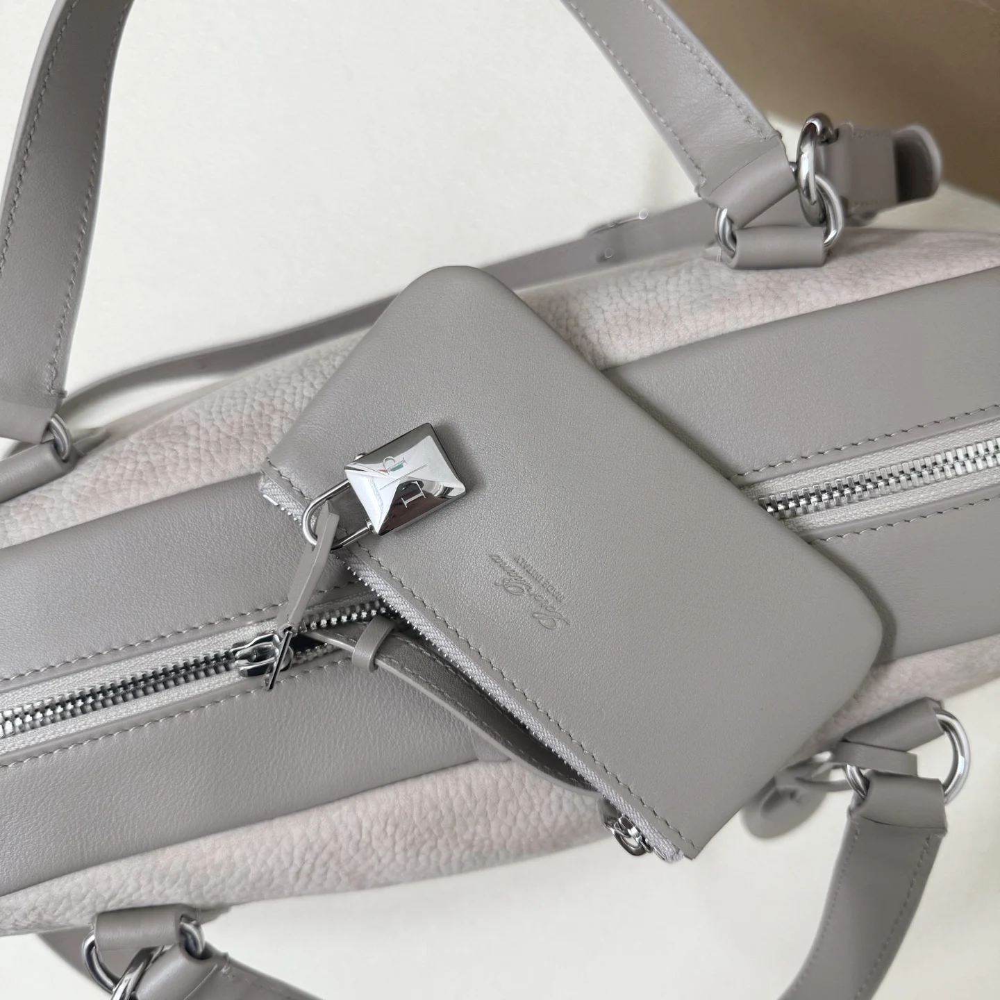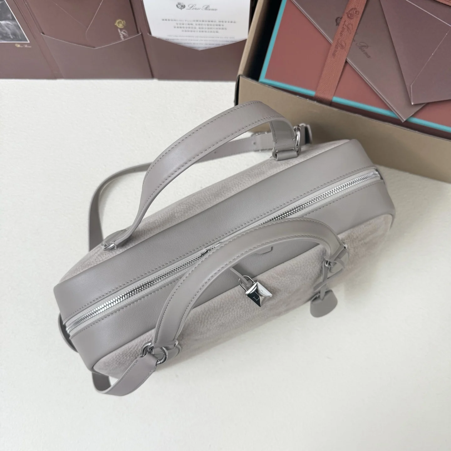 An elegant accessory with compact proportions, the Extra Bag L23 combines timeless style with functionality. Primed for special occasions and everyday elegance alike, it is crafted from Irish silk tweed with Rounded Leather accents. Suspended from the double-zip closure are Loro Piana’s iconic charms, framed by a leather key holder featuring a Ghiera detail.