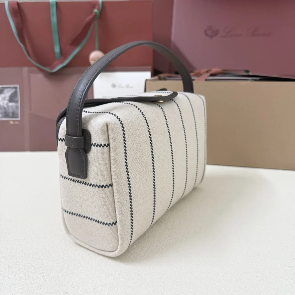 An elegant accessory with compact proportions, the Extra Bag L27 combines timeless style with functionality. Primed for special occasions and everyday elegance alike, it is rendered in cotton-blend fabric with a distinct vintage look and is panelled in leather across the top. Suspended from the double-zip close are Loro Piana’s iconic charms, framed by a refined leather key holder.
