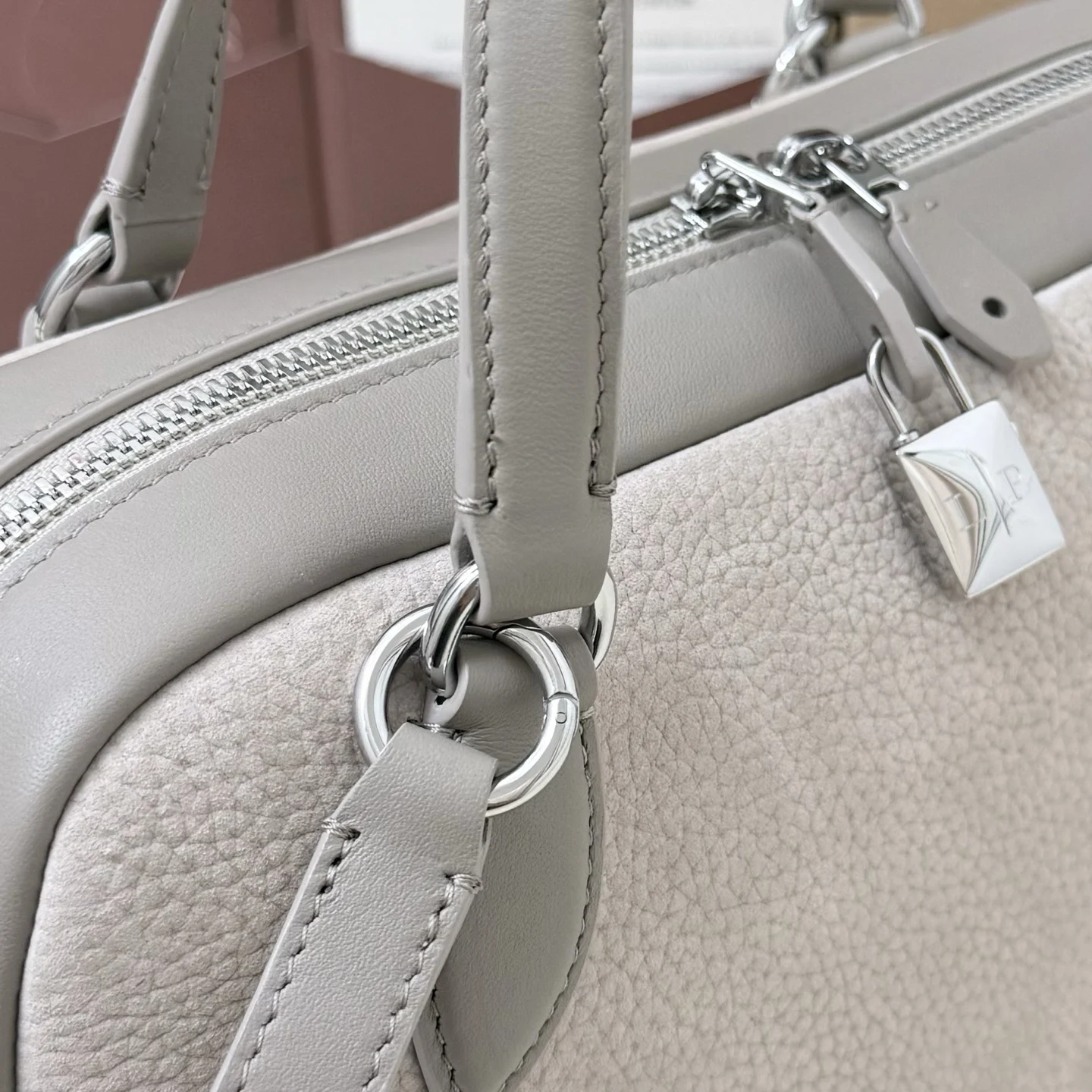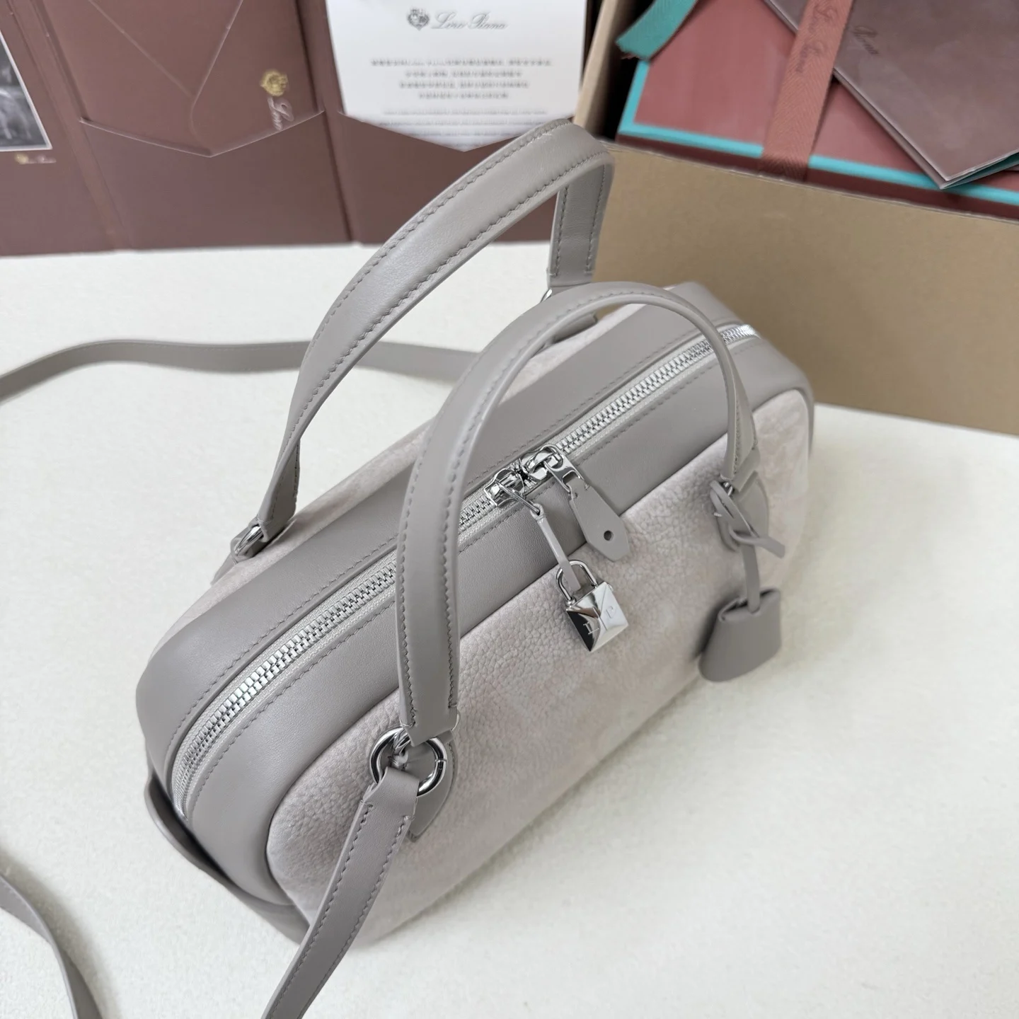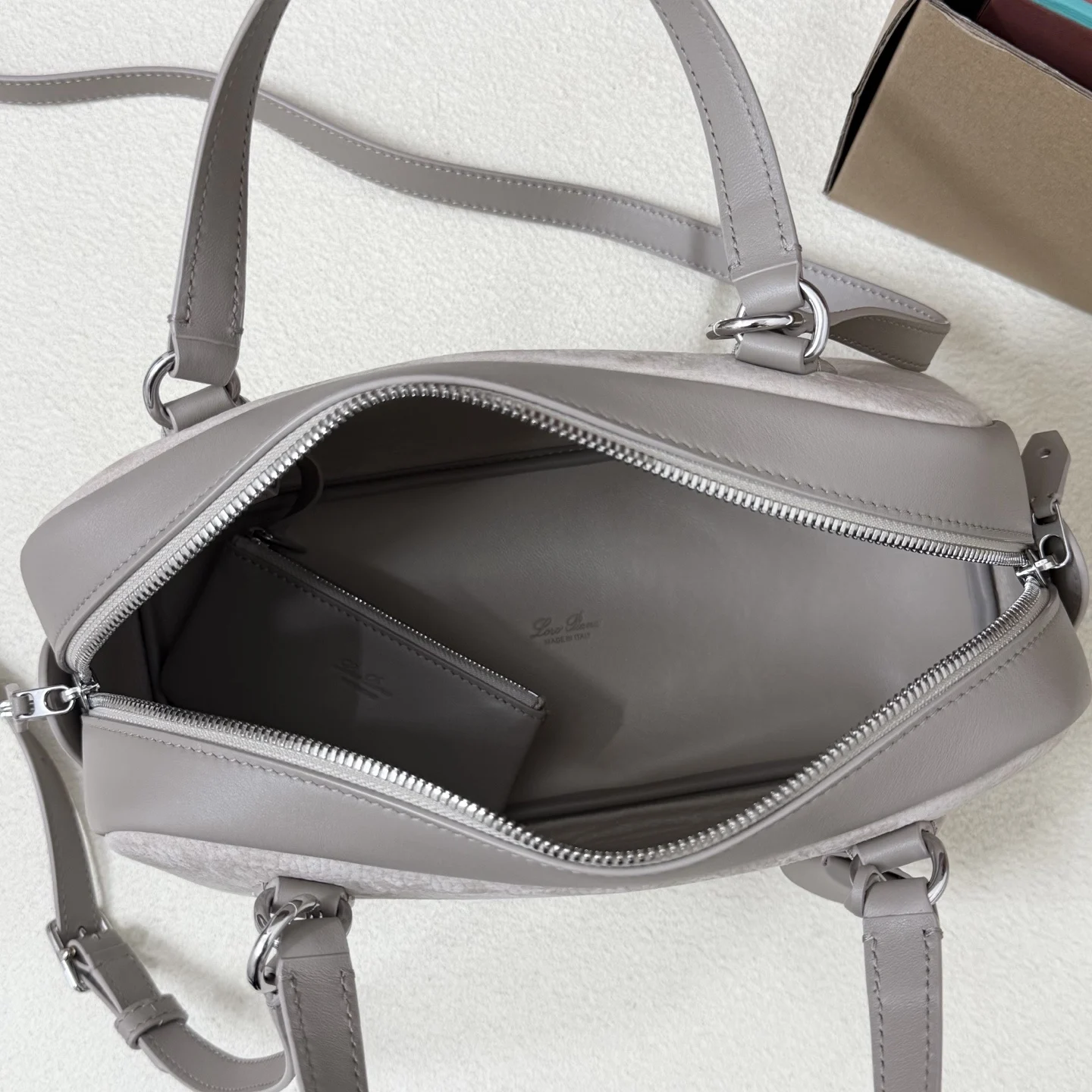 Here presented in a medium size, the Needle is a Loro Piana interpretation of the bowling bag, complete with the iconic LP charms. Evoking the Maison’s textile heritage, it is inspired by the bags used to carry knitting needles. It is constructed with soft, sinuous lines, allowing for versatile wear over the shoulder or in hand. Crafted from Grained Nabuk with a velvety suede lining, it has a harmonious silhouette and is made with a single piece of leather along the sides.