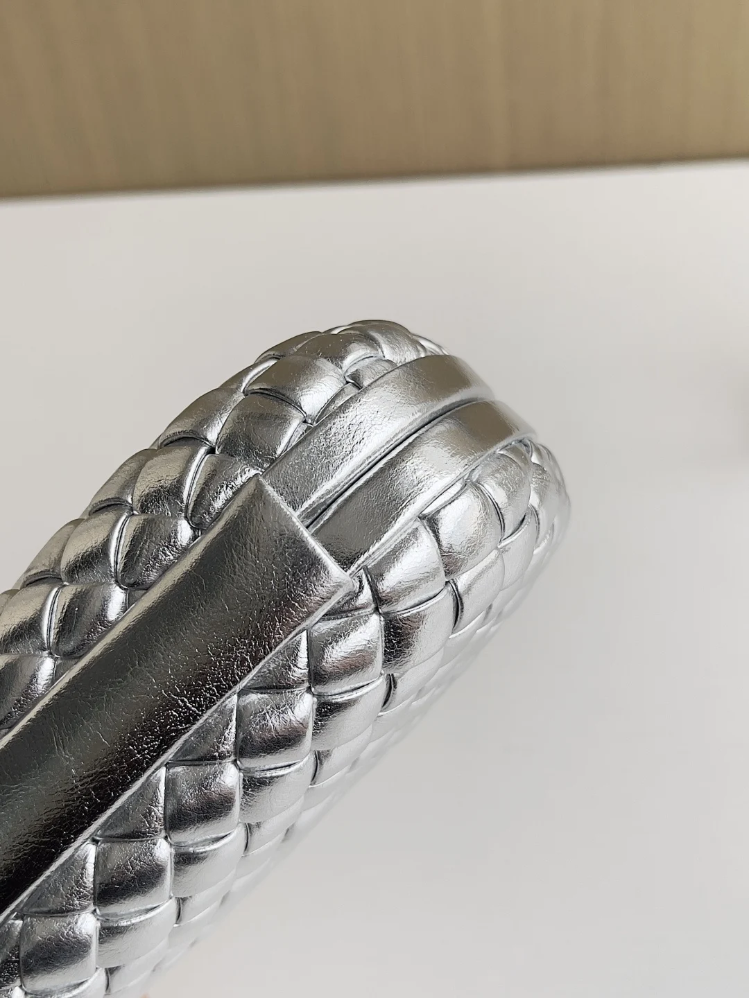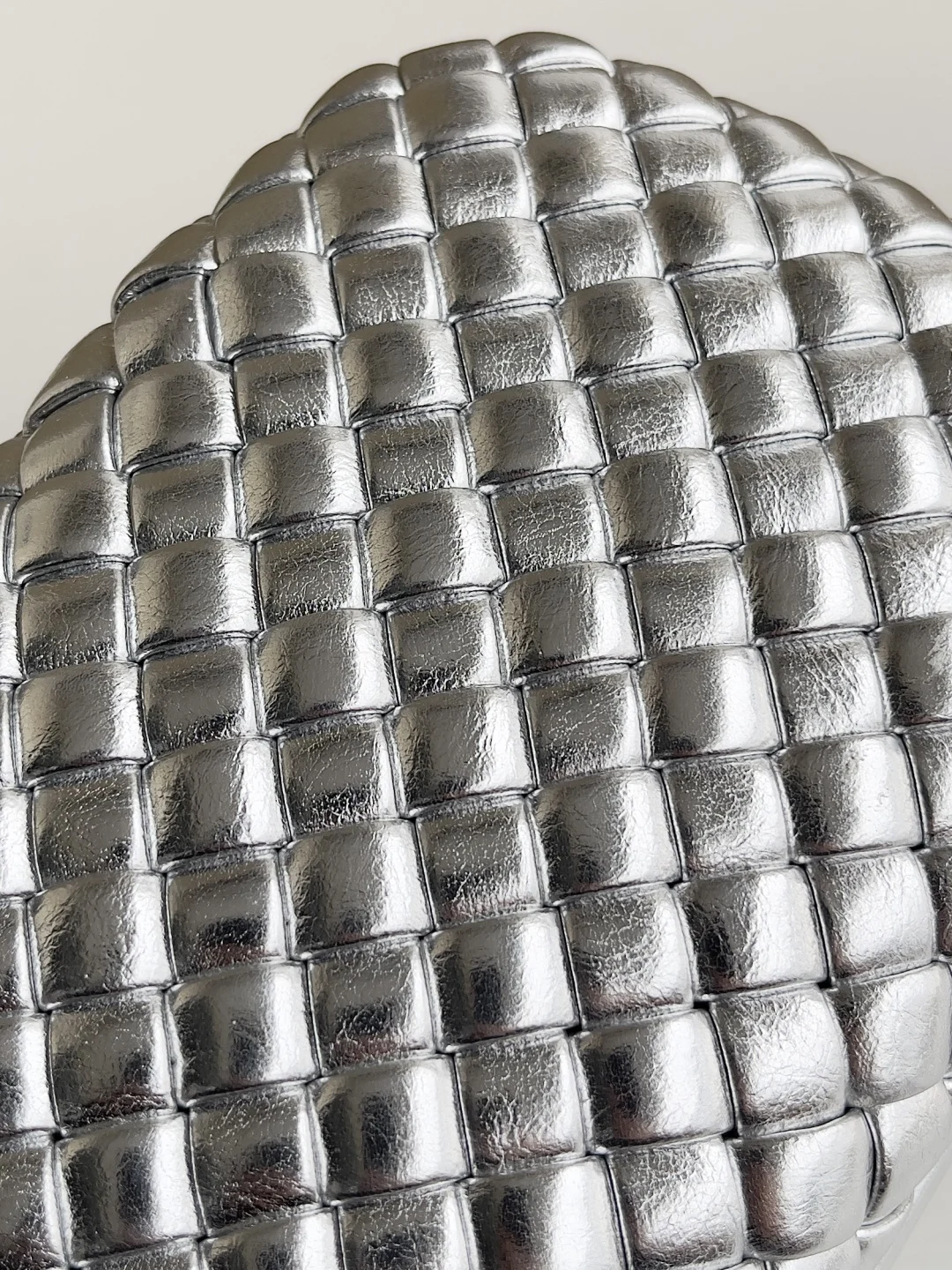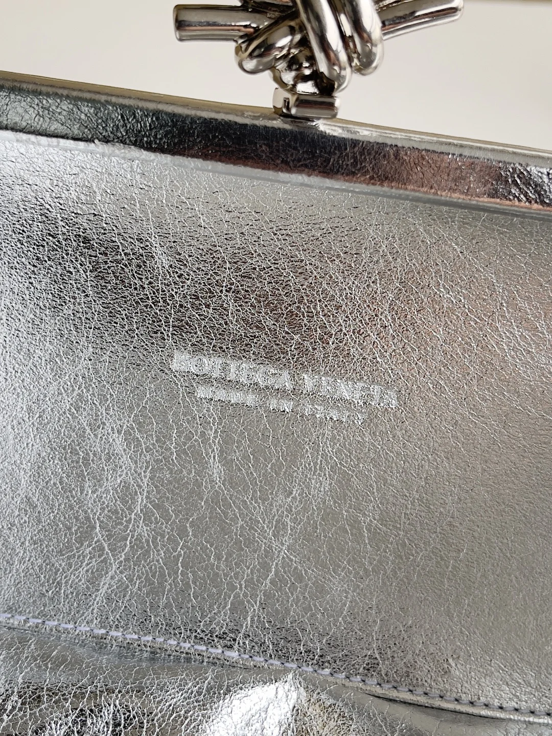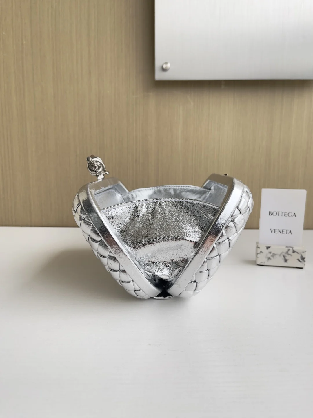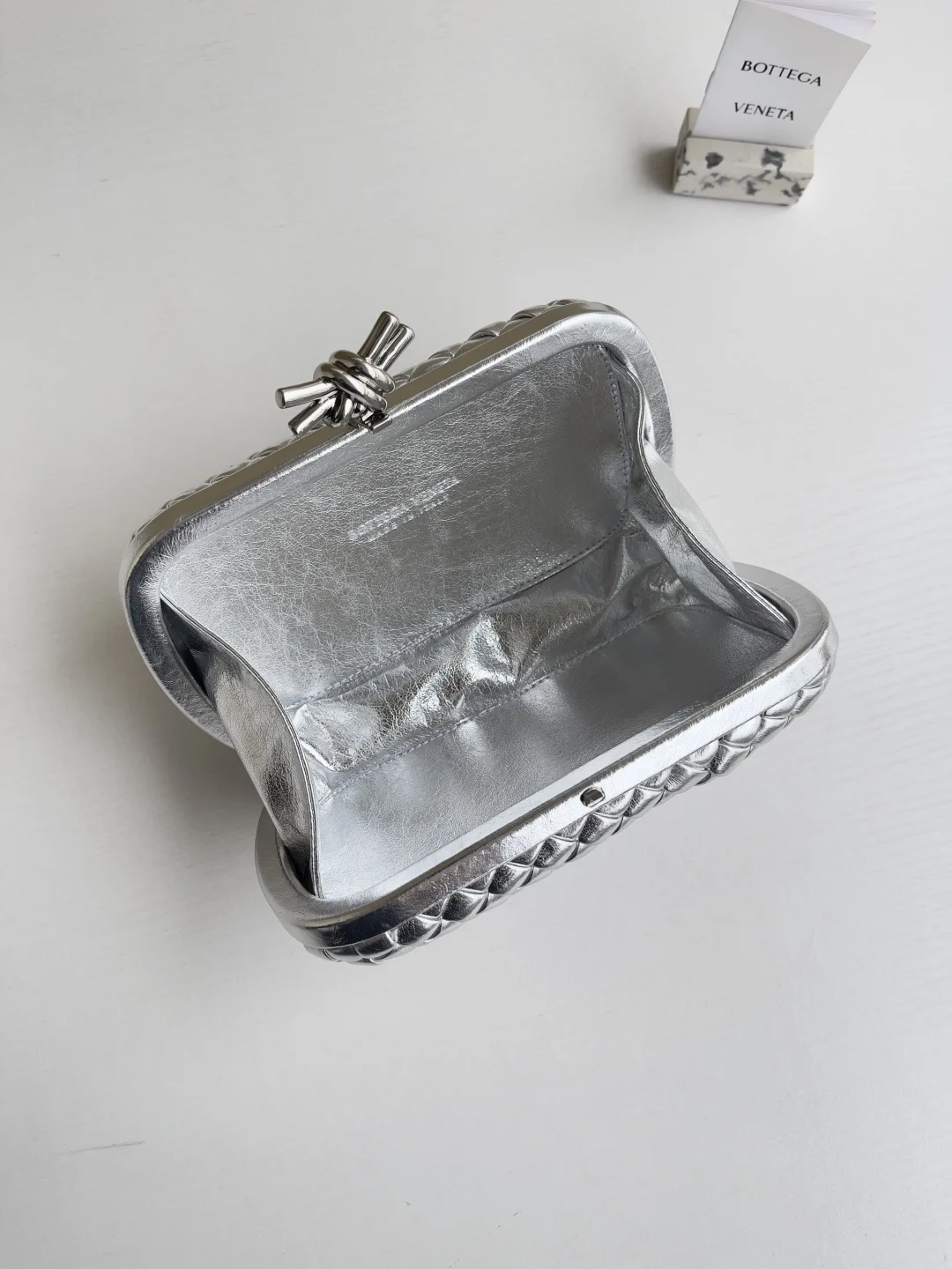 Minaudière clutch in padded Intrecciato wood-embossed laminated leather with signature knot closure.